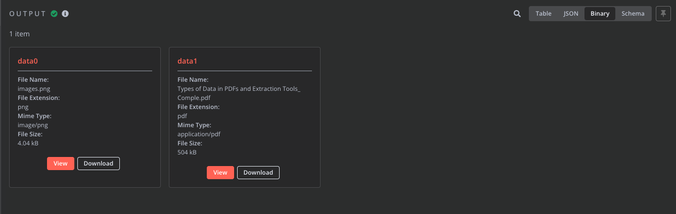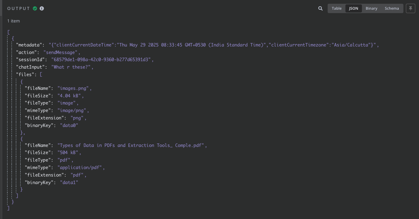 - Uploaded files are sent as binary data to n8n and can be accessed in the Binary tab.