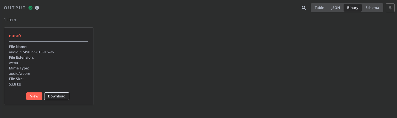 See the screenshots below for how audio files and their metadata appear in n8n: